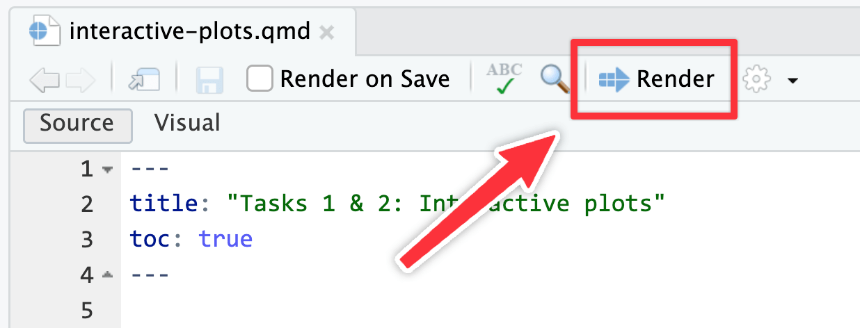 To preview the Quarto document you’re working on, render it like normal using the “Render” button at the top of the editor: