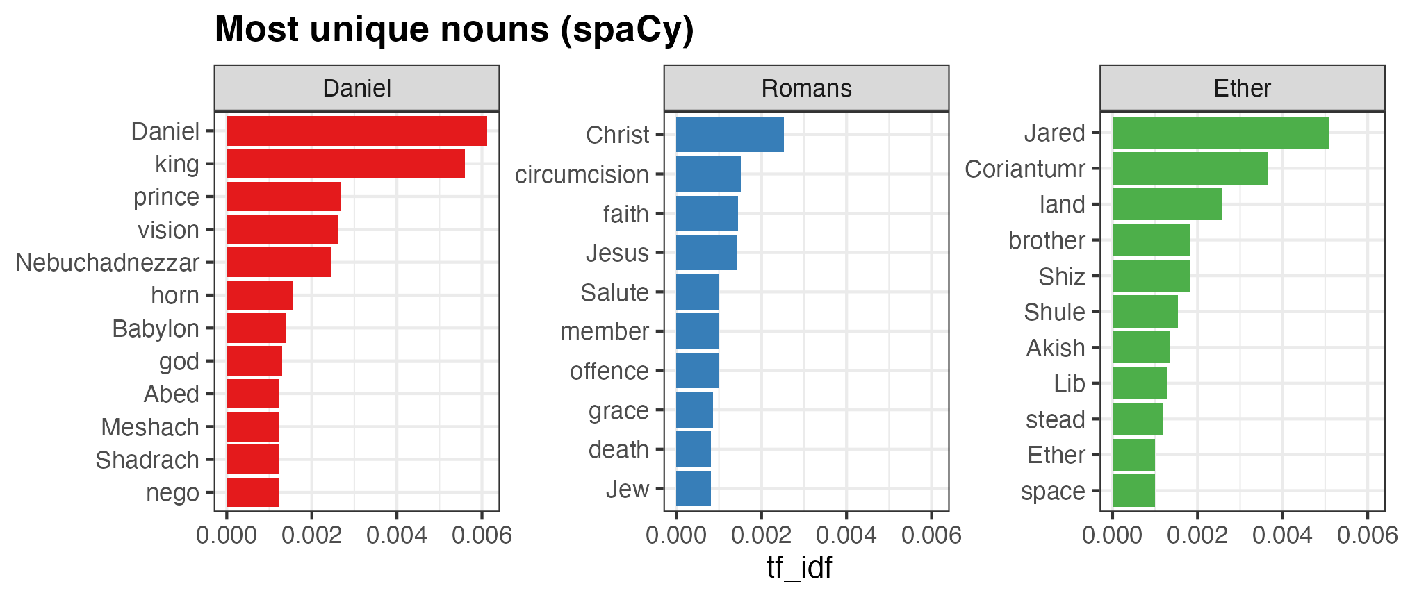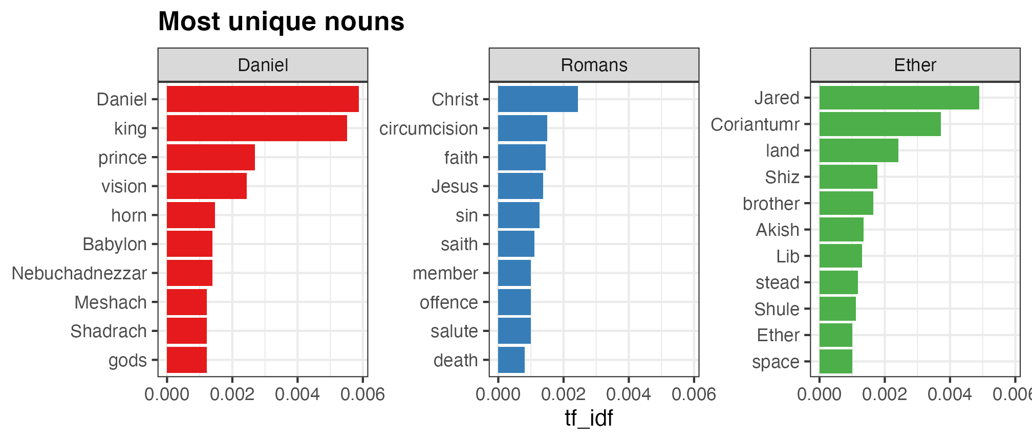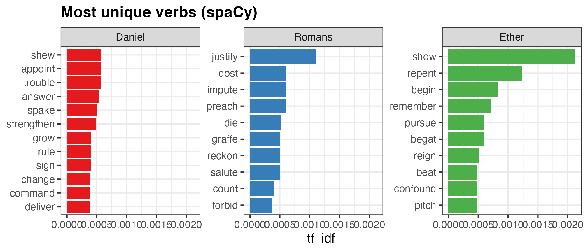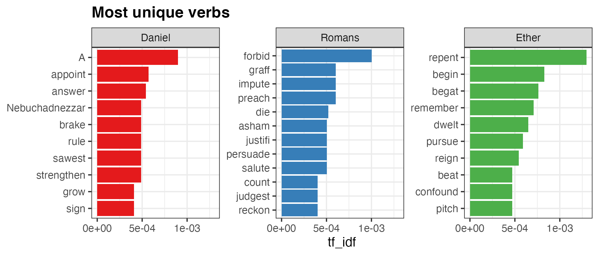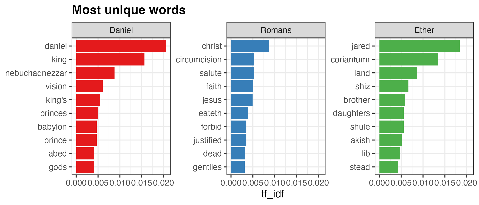 I obviously don’t have your data, but I do have, um, Scripture Power™, so as an illustrative example I arbitrarily chose three books that are roughly the same length: Daniel, Romans, and Ether (all from the {scriptuRs} R package—you’ll probably need to install it if you don’t have it).