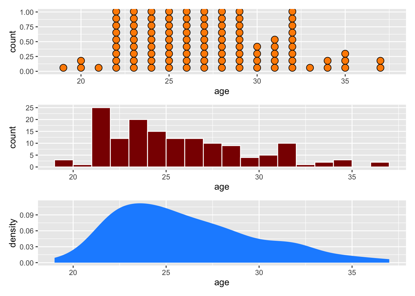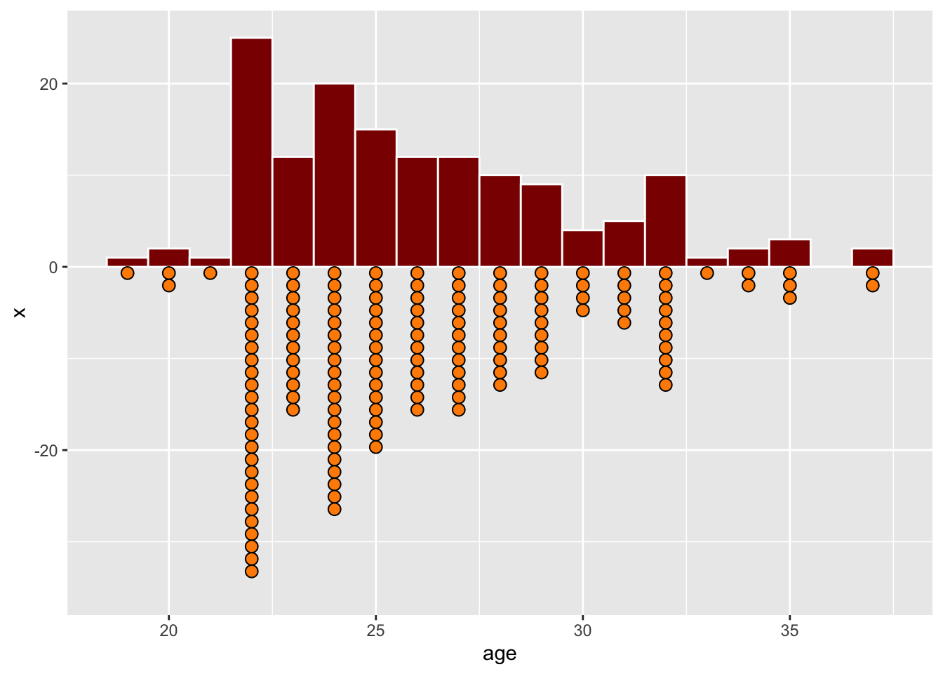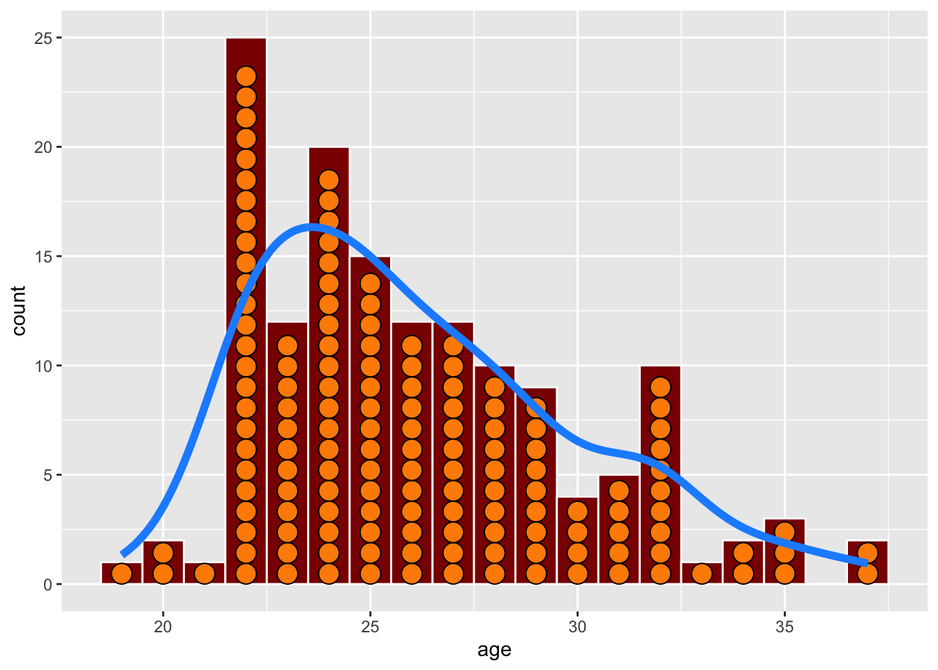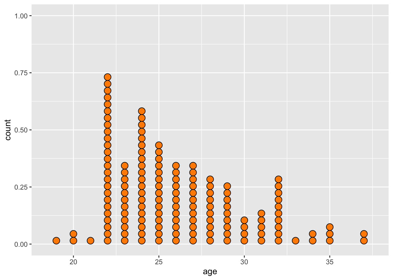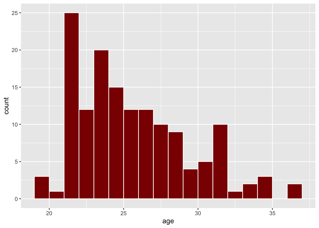 Instead of using dots, we can use a histogram. Here, the bin width is 1, so that the bars show the count of players between 19-20, 20-21, 21-22, and so on. It matches the dotplot: